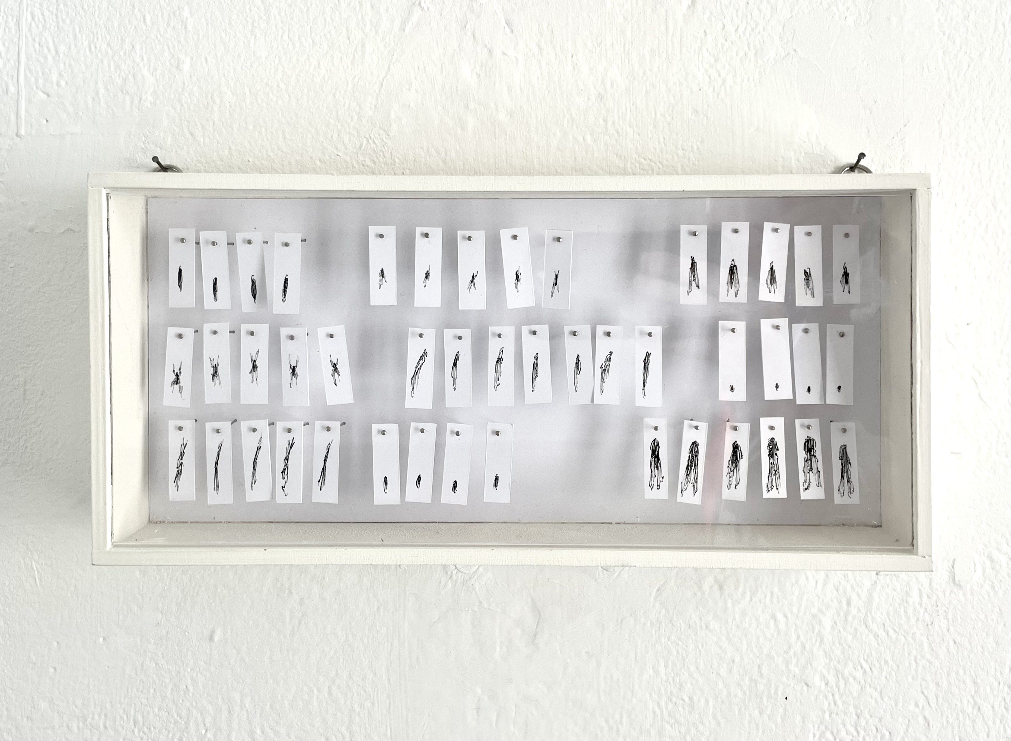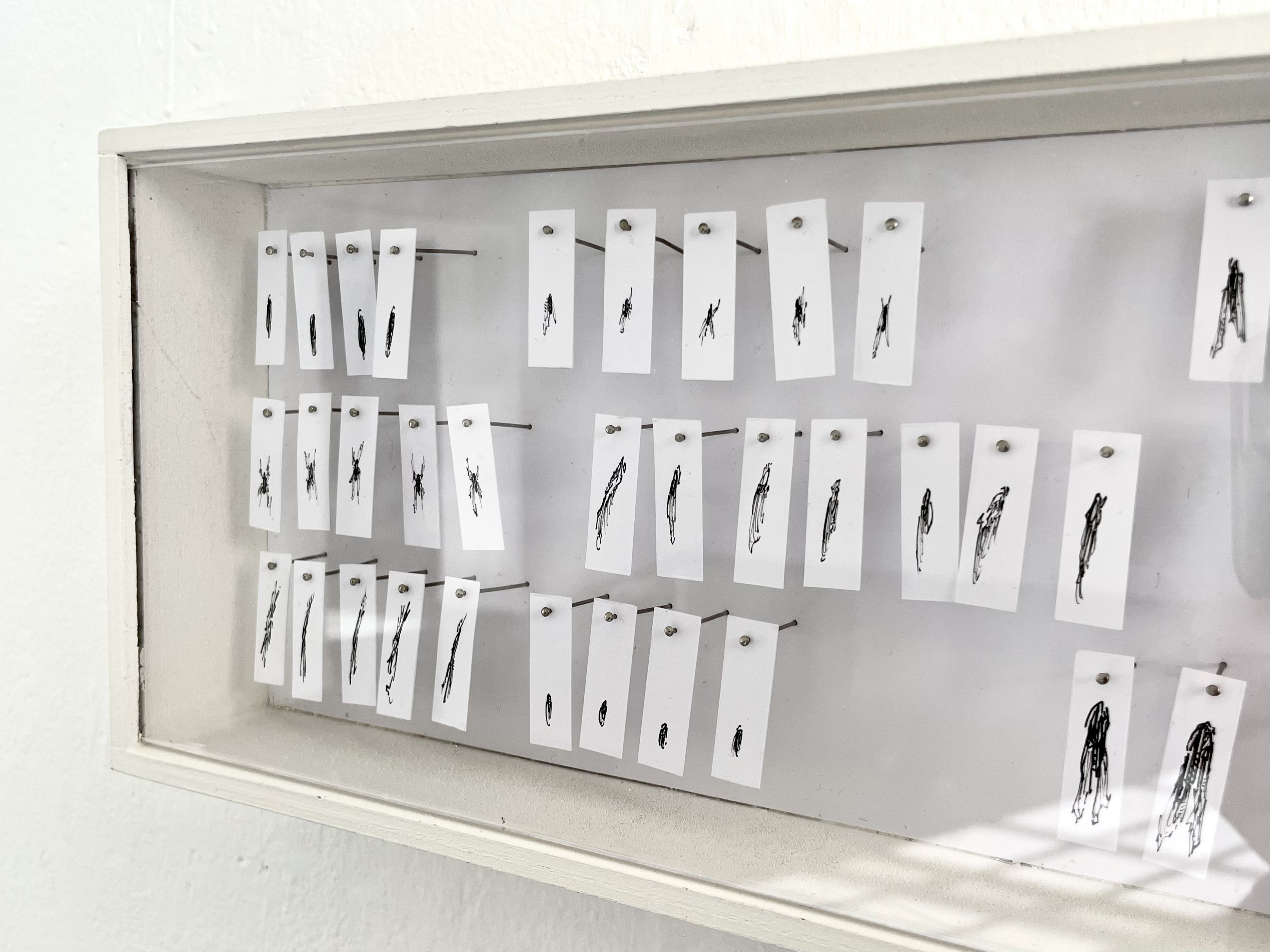 ink on paper, wood, acrylic and pins, 13 x 30cm